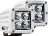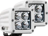 One of RIGID's most versatile, compact lighting solutions just got better with the RIGID D-SS PRO, Dually-Side Shooter Professional Race Output LED pod. Perfect for any application that requires a wide spread beam, including A-Pillars, Fog Lights, and motorcycle applications. The D-SS PRO incorporates powerful optics and recently improved LED technology for greater output with the added benefit of additional LEDs aimed to the side for a much broader beam. The D-SS PRO packs a powerful punch with up to 102% more raw lumens depending on the optics chosen The D-SS PRO fixtures boast up to 120-degrees of horizontal lighting coverage when used in pairs or when used in the single light applications. The main forward-facing LEDs are available with RIGID's advanced Spot, Flood, or Driving optics, so there's a D-SS PRO lighting solution for nearly any application. The D-SS PRO LED lights are available in pairs with three side-shooting LEDs on one side of each fixture, or in single applications with a pair of side-shooting LEDs on both sides of the fixture. Only RIGID provides a broad, powerful lighting solution in such a compact package.