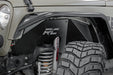 3-piece construction for total protection Keeps mud and debris out of engine bay Easy installation Paintable logo plate Corrosion-resistant black powder coat Improves the look of inner-fender area Includes front driver and passenger side pieces Clean up the look of your inner fenders when using aftermarket flares with Rough Country's JK Front Inner Fender Liners. This eye-catching inner fender upgrade helps protect your engine bay from dust, mud, and debris, and can be easily installed in no-time flat!Aftermarket fenders are a huge improvement for most Jeeps wanting to get the best clearance and articulation possible, but when removing the stock fenders many people also remove the stock fender liners. Regain protection in this crucial area and protect your engine bay from the elements with Rough Country's innovative Front Inner Fender Liners. With a unique 3-piece construction, these liners cover more areas than other liners on the market, giving more protection to your engine bay and body panels. Each Rough Country liner features a corrosion-resistant powder coat for long-lasting durability. Additionally, these liners mount firmly to the body for quiet operation, free of rattling or vibration noise.The solid-steel, angular design with ‘RC†logo cutout gives an aggressive look to this now more visible area on your JK. An included, removable logo plate can be custom painted to any color you wish for a pop of extra color. Rough Country Inner Fender Liners feature a bolt-on installation process with minor drilling for an easy upgrade you can do with common tools in a home garage. Includes Rough Country's Lifetime Replacement Warranty.