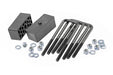 Blocks Tapered to reduce drive shaft angle. Single 9/16-inch pin blocks. 2.5-inches wide. Powder coated black. U-bolts Thread Size: 9/16-inch Inside Width: 2.5-inch Inside Length: 8.5-inch Style: Square E-coated black Corrosion resistant Note: For off-road use ONLY. California Residents: Prop65 Warning. <p>Has the rear of your vehicle started to sag, or are you looking to add a bit of lift height? Whatever the case maybe we have you covered at Rough Country. Upgrade your rear suspension with Rough Country's vehicle-specific block and u-bolt kit!</p> <p>Rough Country's rear block and u-bolt kits provide a simple remedy to an age-old problem that simply happens over the span of your vehicle lift. Each kit offers two rear blocks that are tapered to reduce driveline angles, and are much stronger than the standard cast block option. These heavy-duty replacements feature a single pin measuring in a 9/16-inch to snuggle fit into your factory axle pad. Also included is a set of e-coated corrosion-resistant steel u-bolts. Our u-bolts offer four inches of thread ensuring that you have plenty of length to securely install this kit to the rear of your vehicle in no time flat. </p> <p>Best of all, Rough Country's vehicle-specific kits are backed by Rough Country's Satisfaction Guarantee! </p> <p> </p>