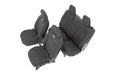 Easy installation Made to factory specifications UV resistant construction 4-Layer construction w/ foam padding and protective polyester shell Neoprene layer offers great breathability and water resistance Includes full covers for front and rear seats - plus headrest covers where applicable One year warranty Note: California Residents: Prop65 Warning Protect your Jeep's seats from water, mud, and anything you can throw at it with Rough Country's front and rear Neoprene Seat Covers. These easy-to install covers fit snugly over your Jeep's seats to protect your interior from the elements while blending in perfectly.These comfortable seat covers feature a 4-layer construction with a thick foam padding for a comfortable feel and durable quality. The outer Neoprene protective layer wards off water and mildew while being soft to the touch and offering great breathability. Each cover is designed to be an exact fit on your vehicle, with accessibility for airbags, seat adjustment, and more!Each kit features a full front and rear set, with front seat covers, rear bench covers, and four full headrest covers (on applicable models) to outfit your entire seating space. No tools required for this fast and simple upgrade, just slip each cover firmly over the seat and fasten with the built-in straps and you're ready to roll!